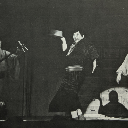Ōtsuka Seigo (Photographer), Chikushi Misuko and troupe performing Inferiority Complex [Higami nesei], February 1980, Kaho gekijō, Iizuka, Fukuoka Prefecture, Japan. Printed in Ōtsuka Seigo, The World of Chikushi Misuko: Saga Niwaka, Woman Zachō of Laughs and Tears [Chikushi Misuko no sekai: Saga niwaka warai to namida no onna zachō] (Tokyo: Gaifūsha, 1981), 42.