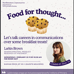Join us for a breakfast event with Larkin Brown, Senior Director of Product Research at Pinterest and COMM_ST alum. Larkin will talk about her career path and share insights on working at the intersection of research, product design, and inclusion. The event will take place during COMM_ST 101-1, and guests are welcome.