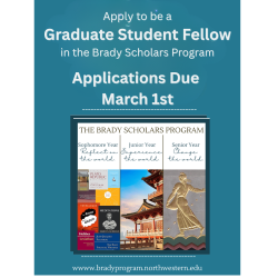 The Brady Scholars Program in Ethics and Civic Life is seeking four graduate students to serve as mentors for undergraduate participants in the program. Each graduate mentor is responsible for four Weinberg College of Arts and Sciences (WCAS) undergraduate students for three years. Mentors will receive a total award of $15,000 spread over those three years. Applications from both within and outside WCAS are welcome. Applications are due by Sunday, March 1.
