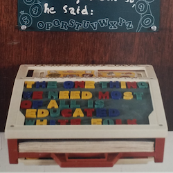 In 1988, an assemblage of kids learning tools, toys, and a handwritten folktale, announced in no uncertain terms the potent, political edge of Benjamin Patterson (1934-2016), a multidisciplinary intermedia artist whose criticality often shrinks in the shadow of his association with Fluxus and its tawdry notoriety. He sourced the folktale from African American popular culture and scrawled it verbatim and in white atop an emerald chalkboard, loudly proclaiming: “THE ONE THING WE NEED MOST OF ALL IS EDUCATED WHITE FOLKS.” In one fell swoop, Patterson, in the guise of a provocateur par excellence, summoned an omnipresent force shaping his experiences within the United States–structural racism–and framed it in terms of child’s play by pairing technologies of adolescent learning with racialized presumptions about need.