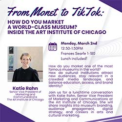 Join us for a lunchtime conversation with Katie Rahn, Senior Vice President of Marketing and Communications at the Art Institute of Chicago. She will share insights into museum branding, audience engagement, digital strategy, and careers in arts and cultural marketing.