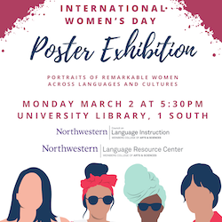 The exhibit will be on display from March 2 - March 31 in the Main Library, 1 South, and consists of 80 posters of remarkable women from around the world. These posters were created by Weinberg world language students and will be presented in the language of the respective woman and in English. 14 languages are represented. Come and support the students, who are learning languages at Northwestern, whose work will be exhibited.